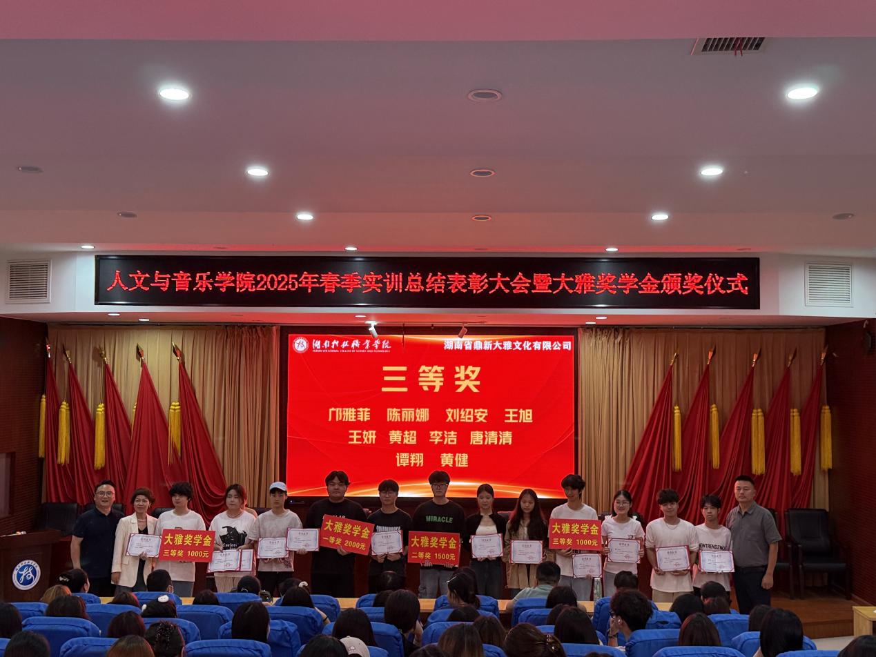 2025年6月11日下午,人文与音乐学院2025年春季实训总结表彰与企业奖学金颁奖仪式在雨花校区多功能报告厅隆重举行。学院负责人、合作企业代表及全体师生齐聚,共同见证这一激励人心的时刻。首先,湖南省鼎新大雅文化有限公司负责人何明瑶宣读了关于