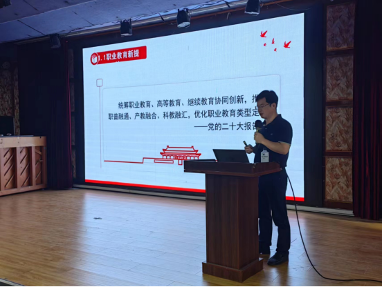 谭见君以《新思想引领新征程 全面深化现代职业教育体系建设 推动学校又好又快发展》为题,从二十大报告关于职业教育的新提法、现代职业教育体系建设的内容及相关政策的解读、职业教育发展趋势等几个方面展开详细阐述,加深了大家对职业教育发展的认识,更加坚定了大家作为职教人的初心。同时他对推动学校高质量发展提出了自己的建议和意见。