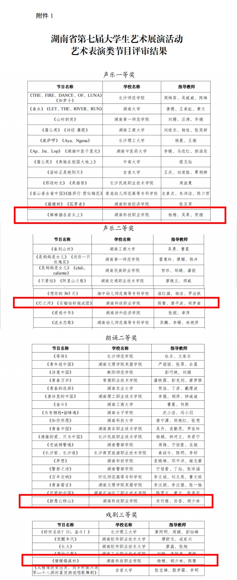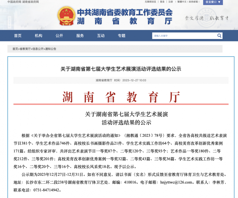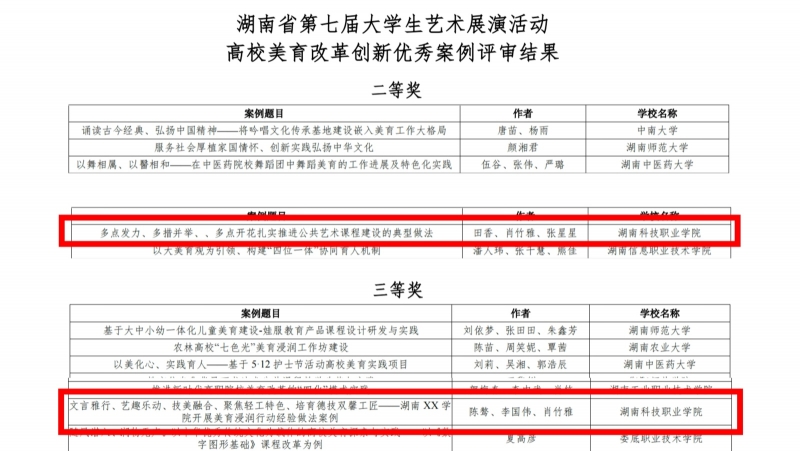 近日,由湖南省教育厅主办的湖南省第七届大学生艺术展演活动评选结果公布。经专家评审,我校人文与音乐学院共获得荣誉6项,其中一等奖1项,二等奖3项,三等奖2项。