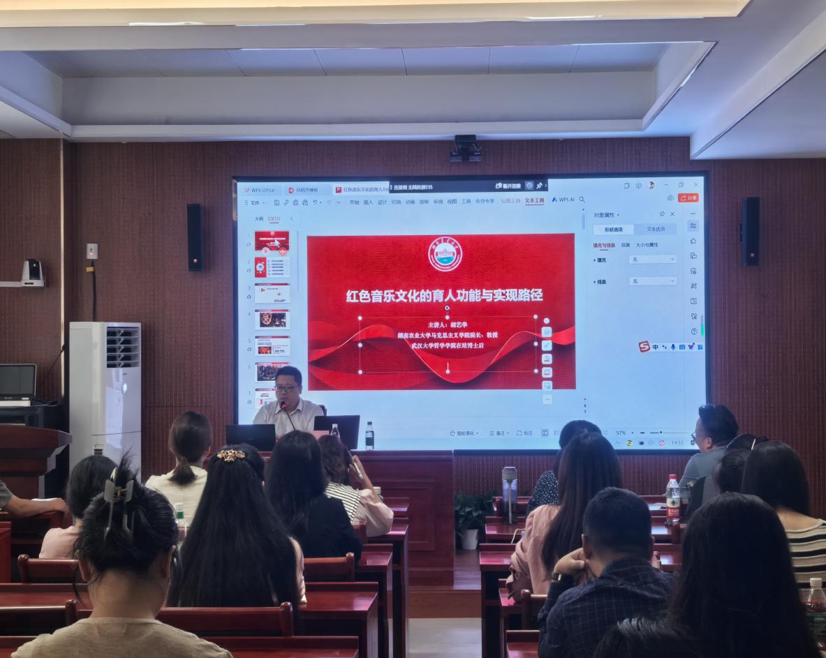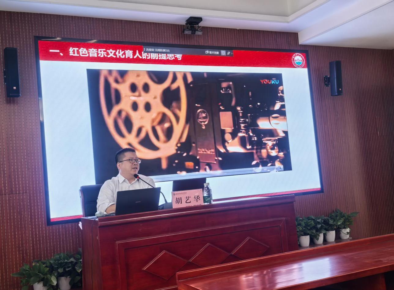 为全面提升学院教师教学科研能力,加强专业课程与思政课程深度融合,深化课程改革力度,推进全员育人、全程育人、全方位育人模式,发挥课堂育人的主阵地作用,全面提升教师教育教学水平,推动学校高质量发展。10月9日下午,我校特邀湖南农业大学马克思主义学院院长、教授、硕士生导师、学科带头人、哲学博士胡艺华教授以《红色音乐文化育人功能与实现路径》为题开展了专题讲座。讲座由人文与音乐学院学院副院长胡少林主持,人文与音乐学院及马克思主义学院全体教师参加。