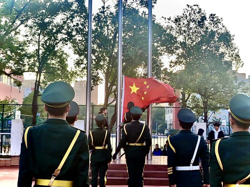 在2000余名师生的注视下,英姿飒爽的国旗护卫队迈着整齐的步伐,护卫着鲜艳的五星红旗庄严入场。伴随着雄壮激昂的《义勇军进行曲》,五星红旗在晨光中冉冉升起。全场师生庄严肃立向国旗行注目礼。
