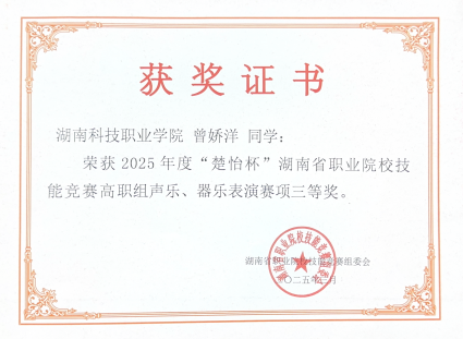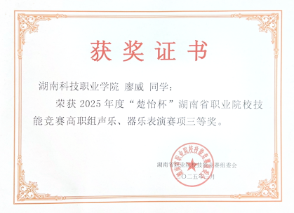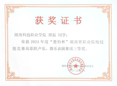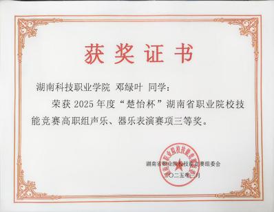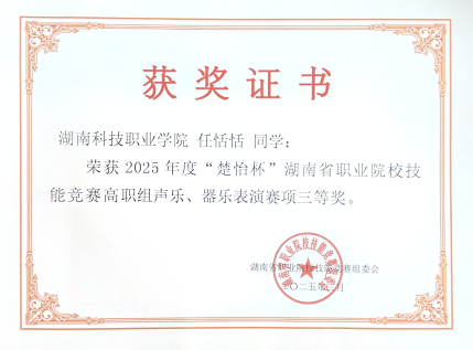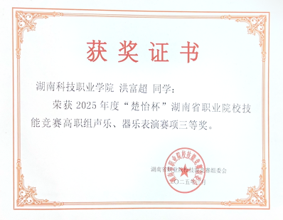 3月21日—24日,2025年“楚怡杯”湖南省职业院校技能声乐、器乐表演赛项在长沙幼儿高等师范专科学校圆满落幕。由胡少林院长、贺继副书记带队,我院两组选手谭磊、邓绿叶、廖威,洪富超、曾姣洋、任恬恬同学,经过激烈的角逐,荣获两项三等奖。这一成绩不仅展现了选手个人的精湛技艺,也彰显了学校在艺术教育领域的卓越成果。
